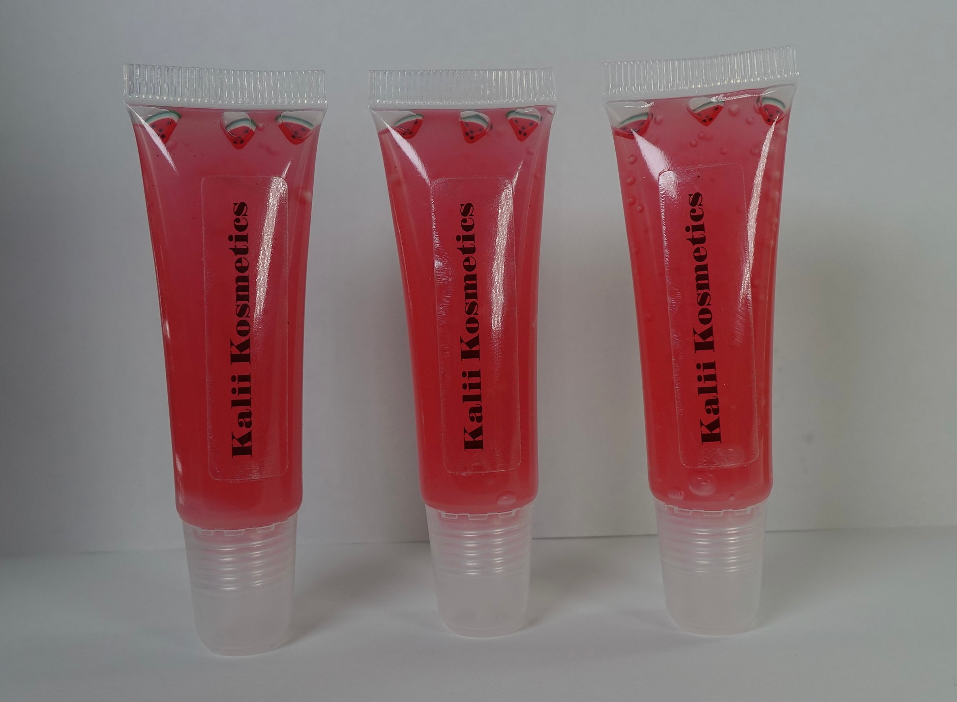 Sheer red gloss with watermelon slice decals. Applies clear